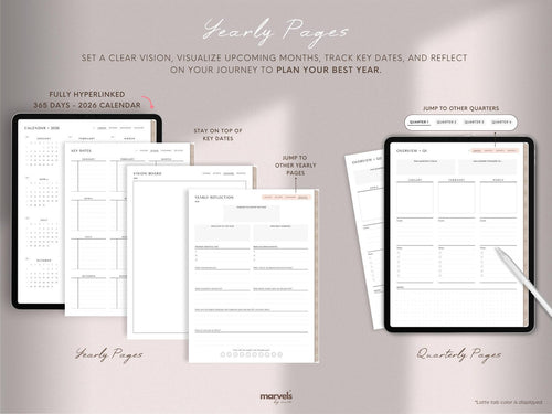 Yes, it covers the entire year. You receive a complete 2026 system with yearly overviews, quarterly breakdowns, plus monthly, weekly, and daily pages. It is designed to keep you grounded and productive from the start of January right through to the end of December.